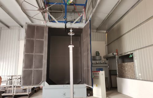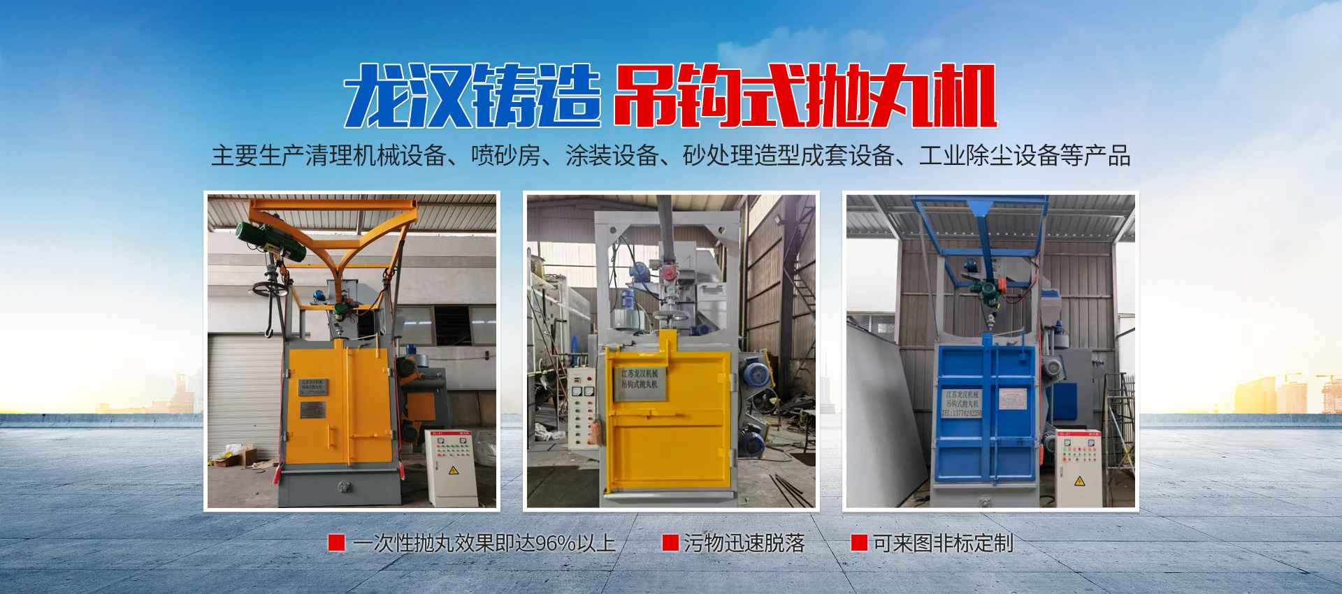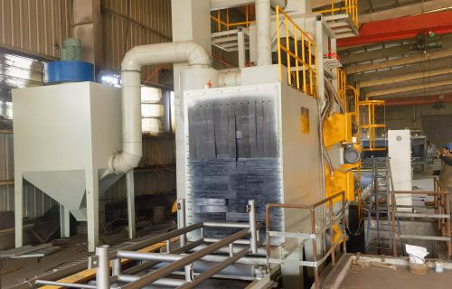 【現(xiàn)場安裝圖集】:簡介:吊鉤式拋丸機分為單吊鉤和雙吊鉤,拋丸機由吊鉤裝載工件交替進(jìn)入拋丸清理室內(nèi)。利用拋...